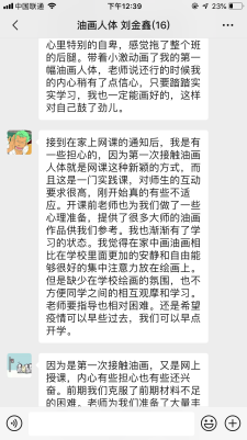 在理论课结束后,便步入实践技巧教学的核心部分!但是,由于疫情的原因造成学生无法买到所需画材以及不同学生对于综合材料专业的认识不同,这就要求在实践教学中要根据学生的实际情况进行灵活的指导。本班学生在本周当中色粉绘制一人,电脑绘制三人,两人水彩,其余皆可油画绘制!第一周采取临摹的方法,上图四张即为本周学生作业,从效果上来看还是有很多可取之处,学生也能够在家里安静的画画!但是,以往我们的课堂教学学生们沟通很多,虽然现在可以通过qq会议等交互软件进行集中讲评,缺少直观的感受还是对学生学习心理产生了一定压力,在课堂反馈中也有多名学生提及(如下图内容所示)!