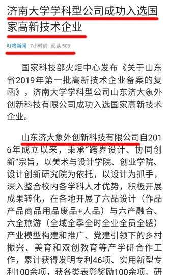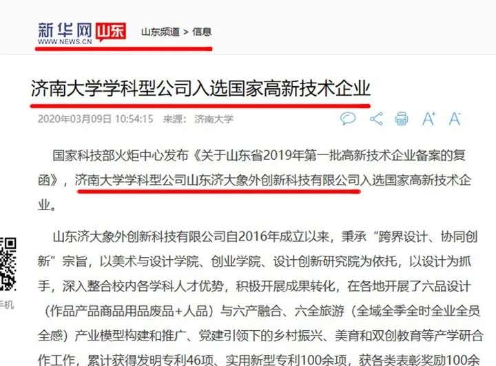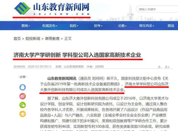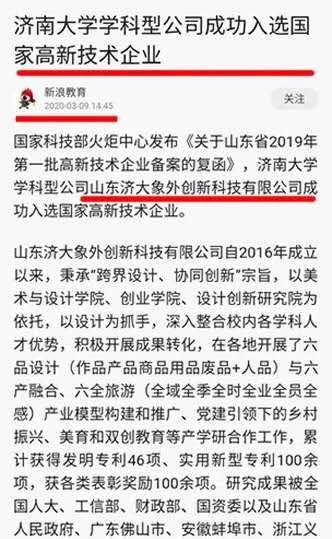 新华网、新浪网、齐鲁壹点、叮咚FM等多家媒体报道:学科型公司山东济大象外创新科技有限公司顺利通过国家高新技术企业认定。这家专门做设计的企业是williamhill中国的一个科研成果转化平台,2016年刚刚成立,很多设计力量其实就是WilliamHill中文的师生。