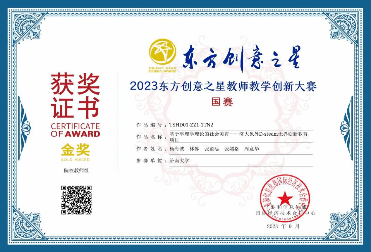 团队“基于事理学理论的社会美育——济大象外D-steam无界创新教育项目”,从中华传统文化中汲取思想精华,结合信息时代学习的特点,通过对国际"STEAM"课程的本土化改良创新,首创"D-STEAM"以设计(Design)引领科学(Science)技术(Technology)工程(Engineering)艺术(Arts)数学(Mathematics)多学科融合创新的通识教育体系。该体系专注于全生命周期创新思维开发和创新能力培养,培养受众用跨界无界思维进行系统的体验、感悟、分析、认知、表达和创造,最终综合提升个人创造能力和多元智能。