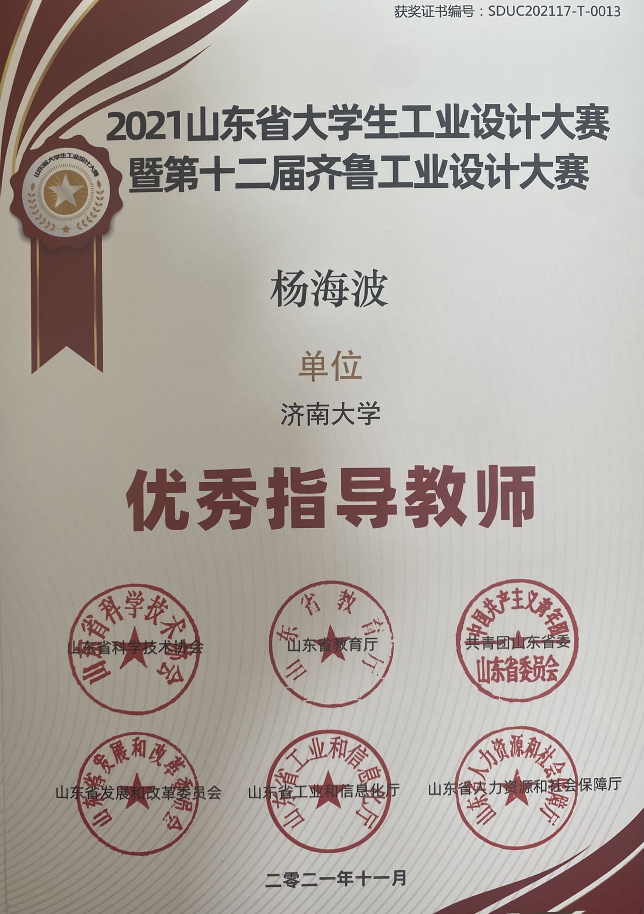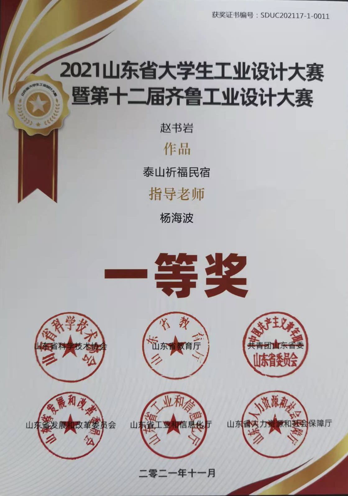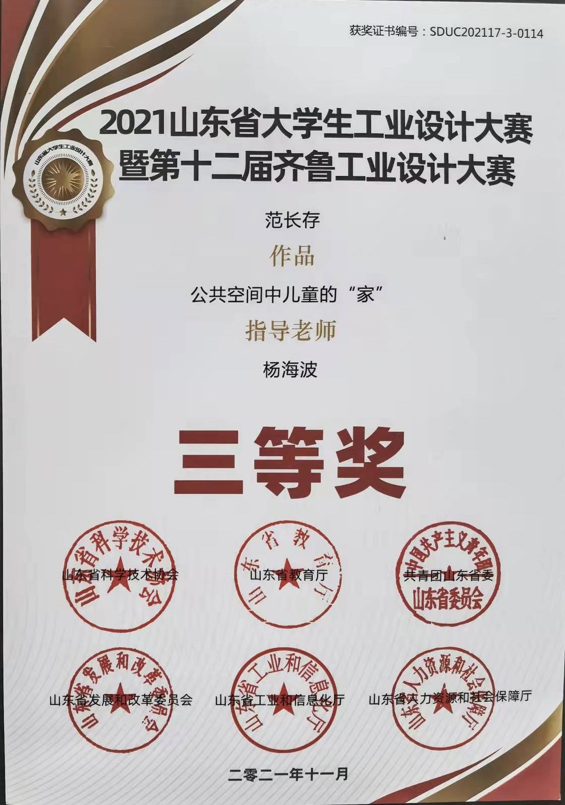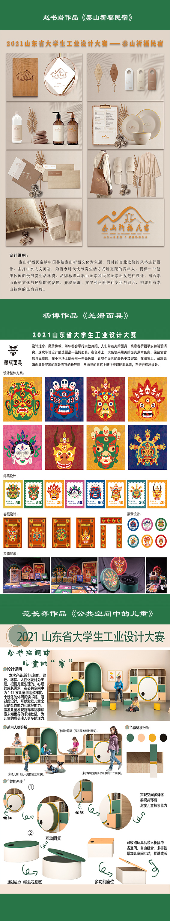 由山东省教育厅、共青团山东省委员会、山东省发展和改革委员会、山东省工业和信息化厅、山东省人力资源和社会保障厅、山东省科学技术协会、联合发起的第十三届山东省大学生科技节——“2021山东省大学生工业设计大赛暨第十二届齐鲁工业设计大赛”于近日圆满落下帷幕。我院师生在本次比赛中硕果累累,成绩斐然。其中,2021级艺术设计专业研究生赵书岩同学作品《泰山祈福民宿》获一等奖;2021级艺术设计专业研究生杨博同学作品《羌姆面具》获一等奖;2021级设计学专业研究生范长存同学作品《公共空间中儿童的“家”》获三等奖;杨海波获优秀指导教师奖。