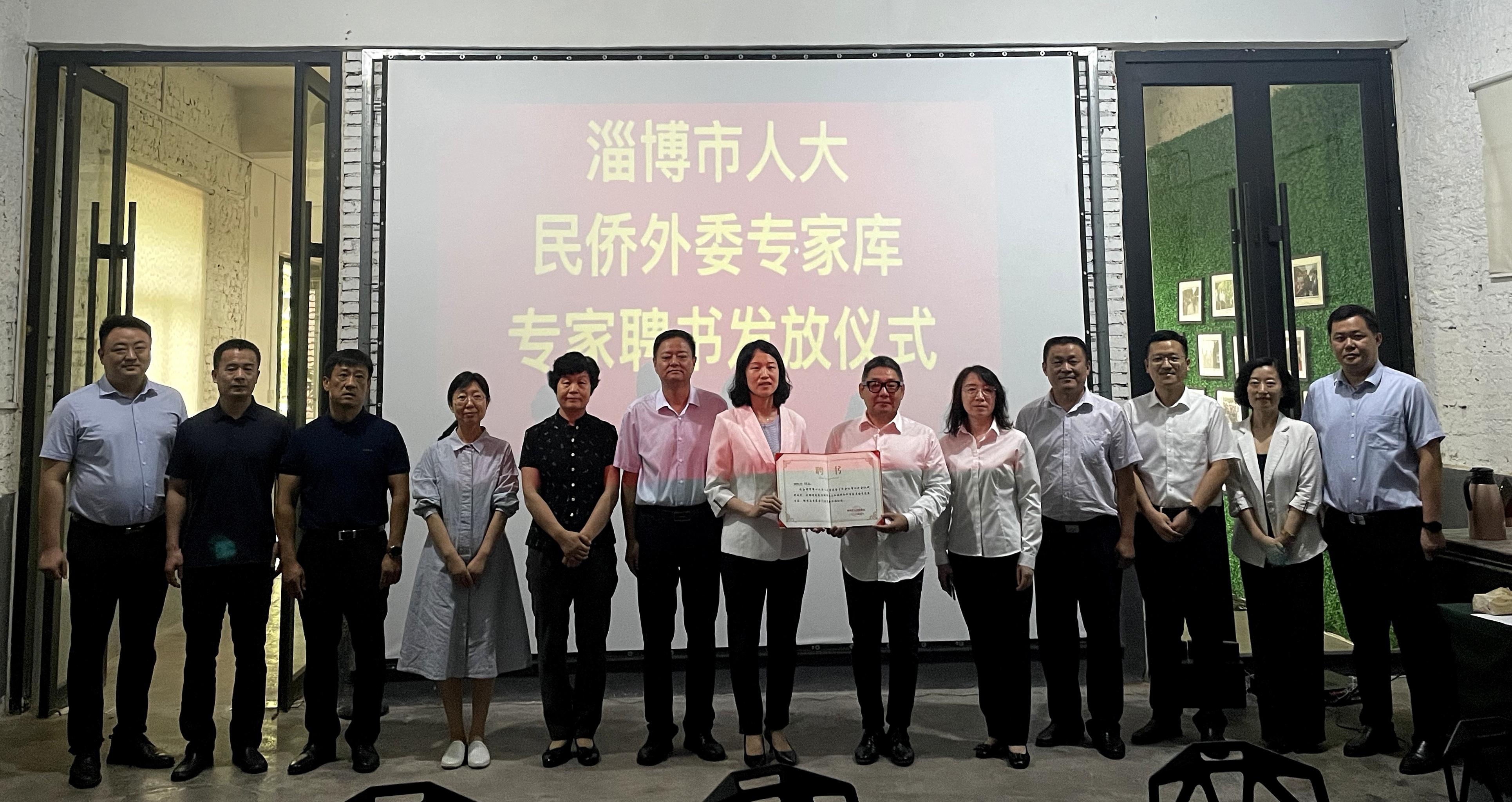 6月29日,淄博市人大民侨外委副主任委员、工作室主任吴艳为邵红升院长颁发市人大民侨外委专家库专家聘书。
