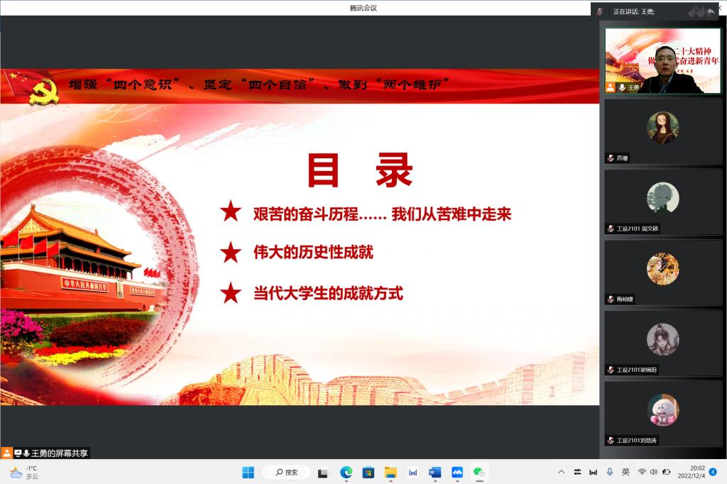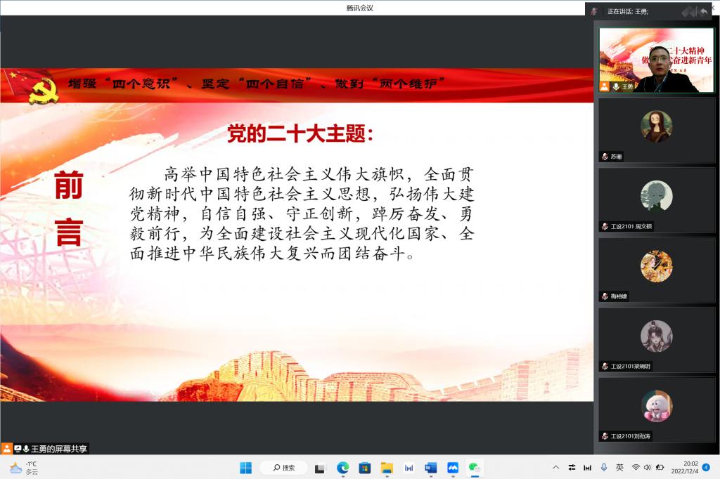 12月4日晚,设计学院线上举行学习贯彻党的二十大精神主题宣讲会。学院党委书记王勇作主题宣讲。学院师生党员、入党积极分子及部分学生代表参加会议。
