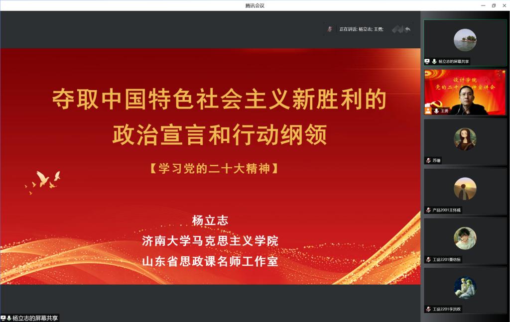 为深入学习贯彻党的二十大精神,领会二十大精神内涵,将二十大精神内化于心。1129日下午,设计学院党委邀请学校“百人宣讲团”成员、山东高校思政课教学名师工作室主持人、马克思主义学院副院长杨立志教授为全院师生作了题为《夺取中国特色社会主义新胜利的政治宣言和行动纲领》的专题报告。