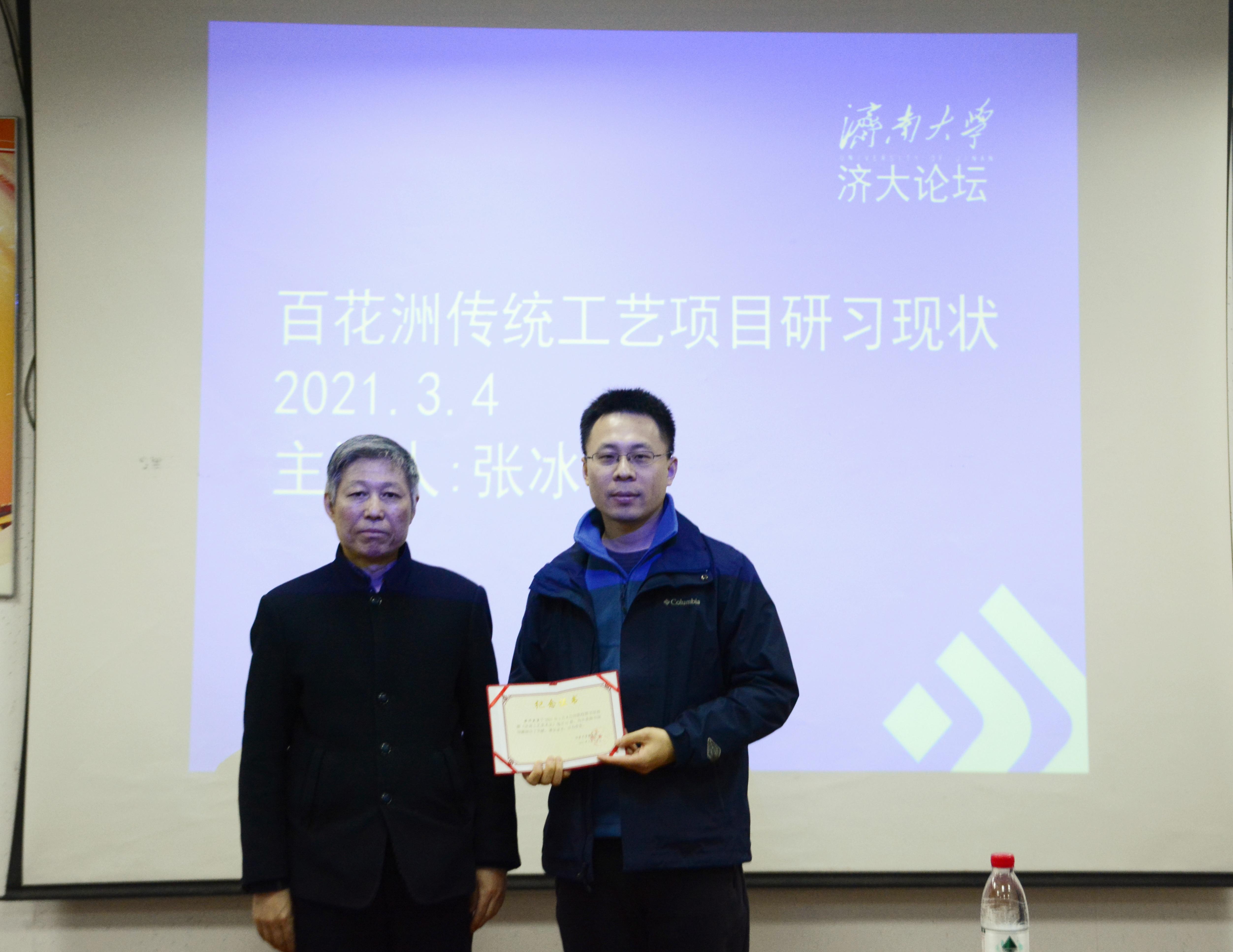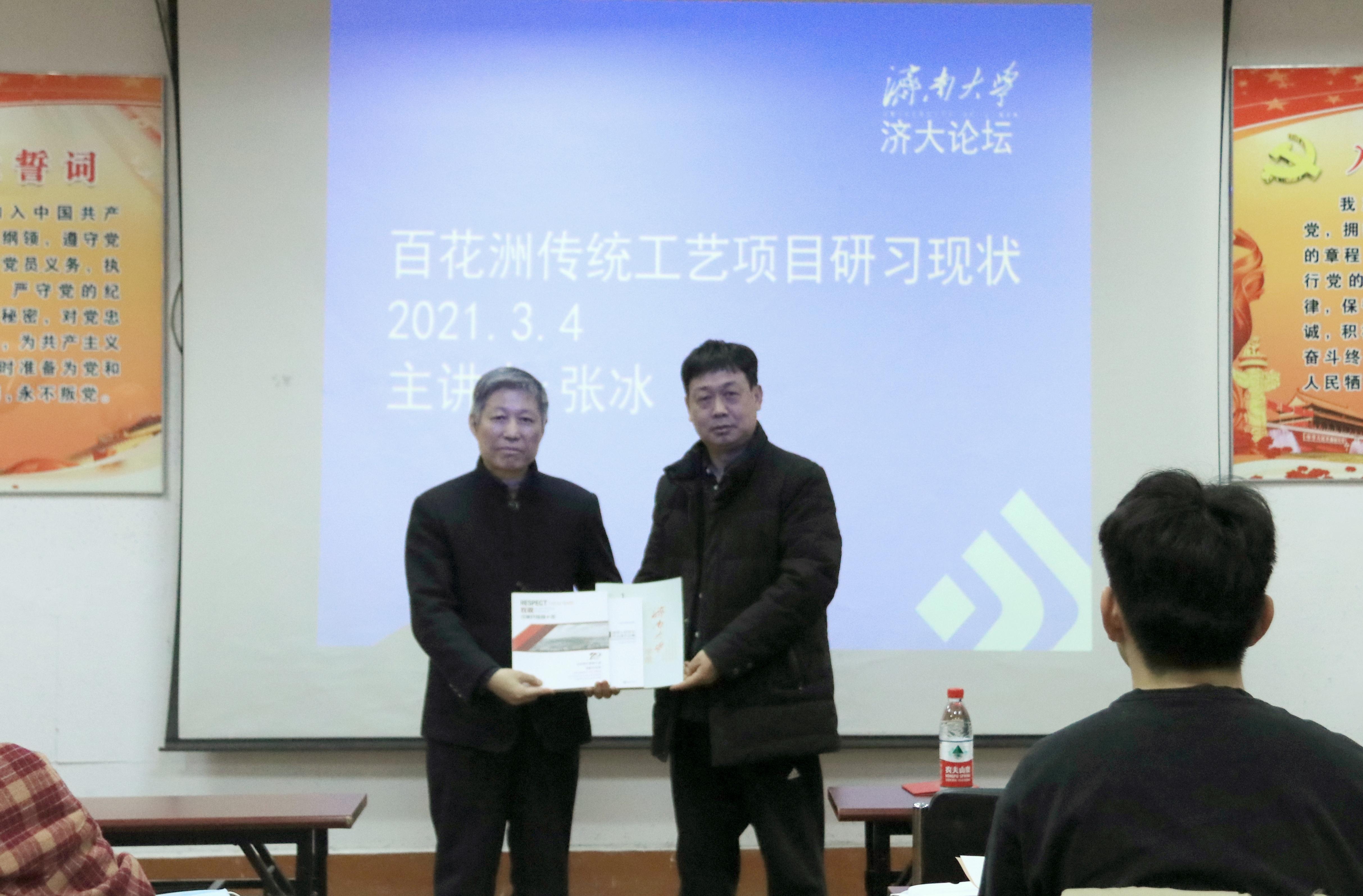 讲座开始前,张冰先生将自己的著作捐赠给学校图书馆,赵院长隆重介绍了张冰先生的手工艺生涯和成就、荣誉等,并为张冰先生颁发图书捐赠纪念证书。刘东涛老师向张冰先生赠送williamhill中国学报、WilliamHill中文研究生作品集。在同学们热烈的欢迎后,张冰先生向同学们介绍了“济南百花洲传统工艺工作站”的非遗、手工艺项目保护发展现状。