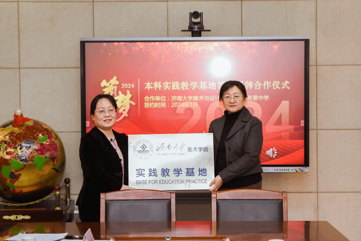 张婷主任对济南泉景中学进行了“实践教学基地”授牌。杨海波副院长和冯晓青校长就《williamhill中国本科实践教学基地建设协议书》进行了签约。与会领导为泉景中小全体美术老师颁发“校外优秀教育实习指导教师”证书。