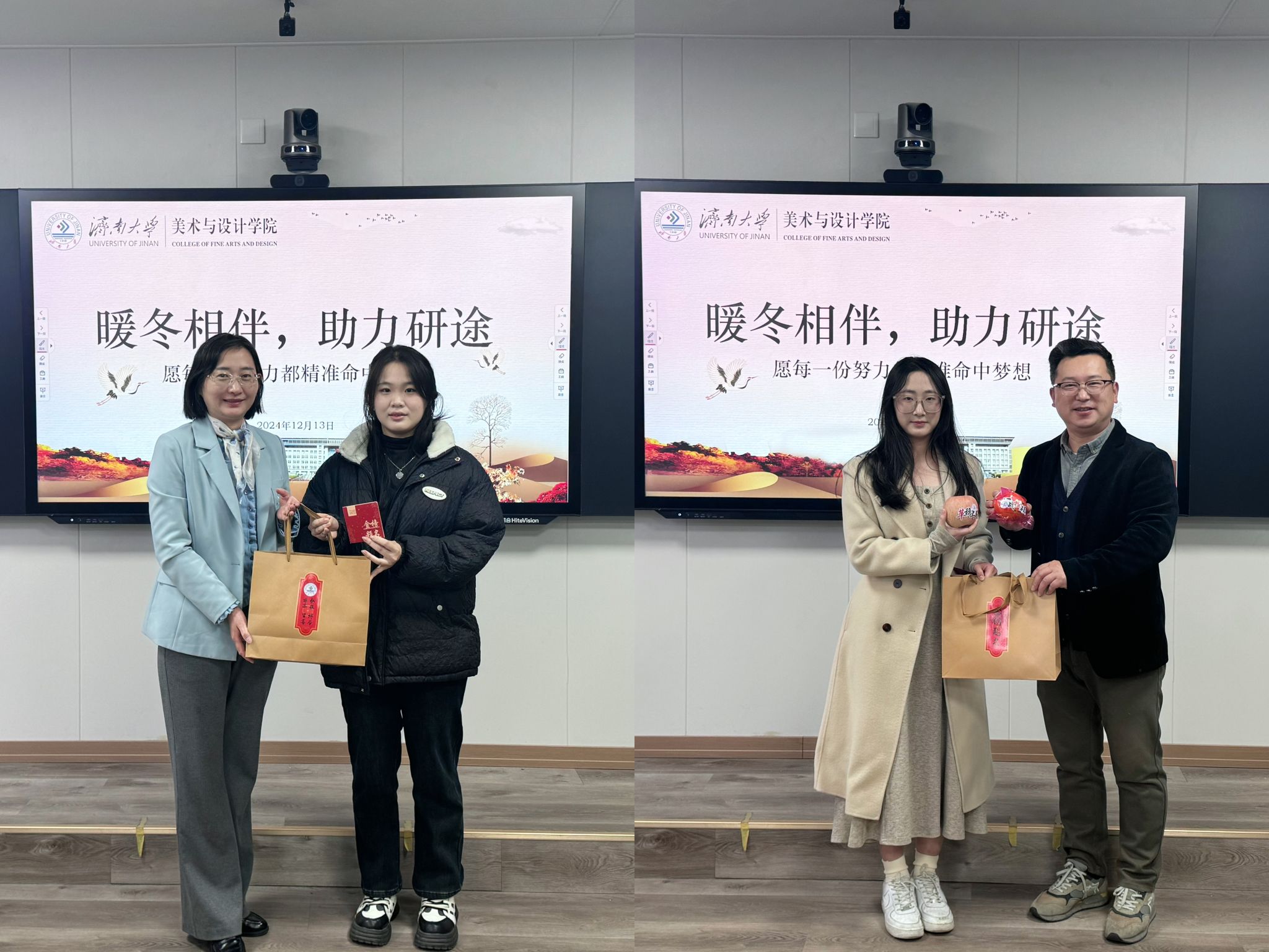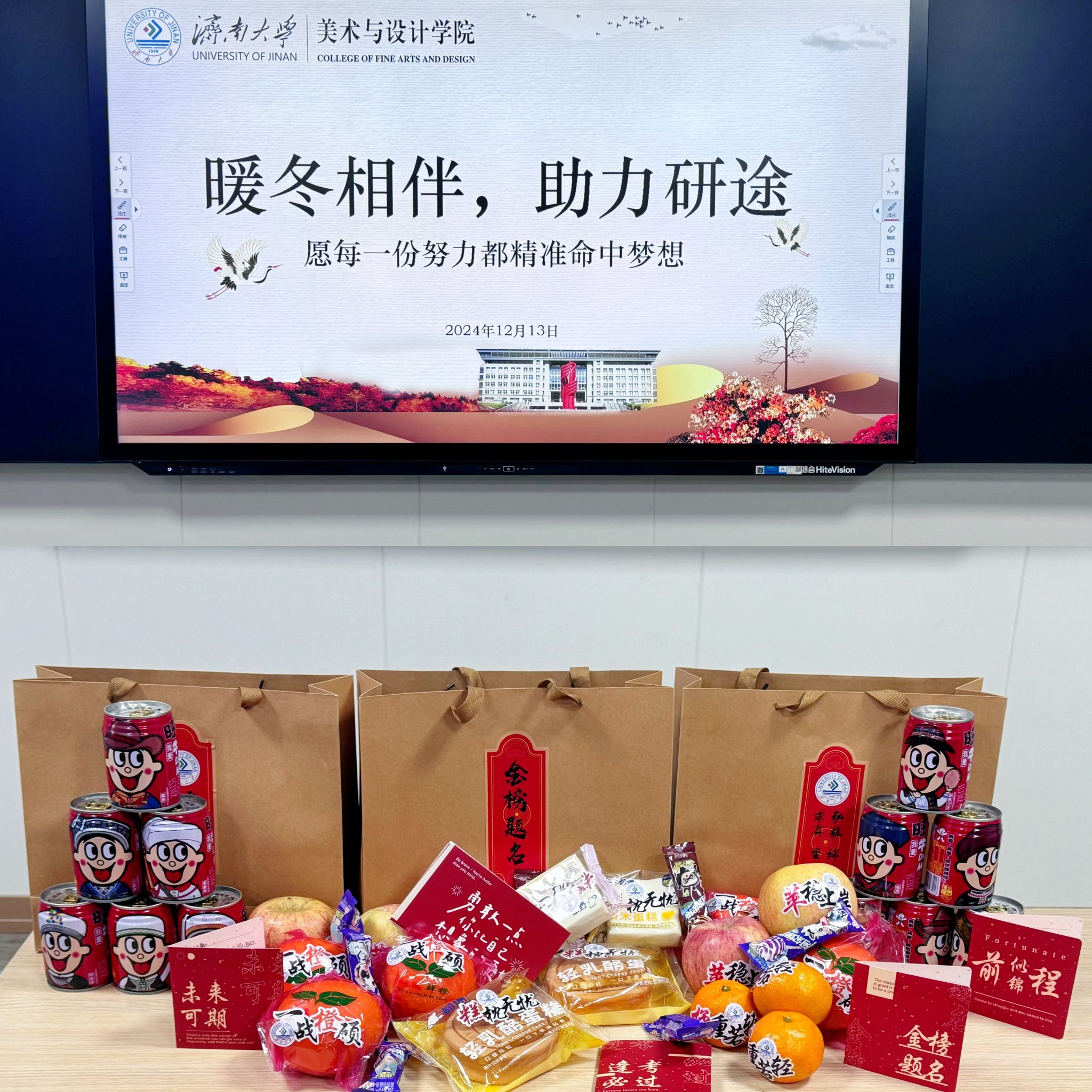 活动结束后,学院领导为同学们发放精心准备的“考研加油包”,礼包中有代表着“橘”重若轻、“糕”枕无忧、“棒”上有名、“苹”安上岸、一战“橙”硕、一“旺”到底特殊寓意的各项礼品,还有一张由学弟学妹们精心设计的手写明信片,明信片上一字一句承载着对学长学姐的期盼和鼓励。收到“考研助力包”的学子备受鼓舞,纷纷表示将全力以赴,以实际行动回馈每一份沉甸甸的关心与祝福。